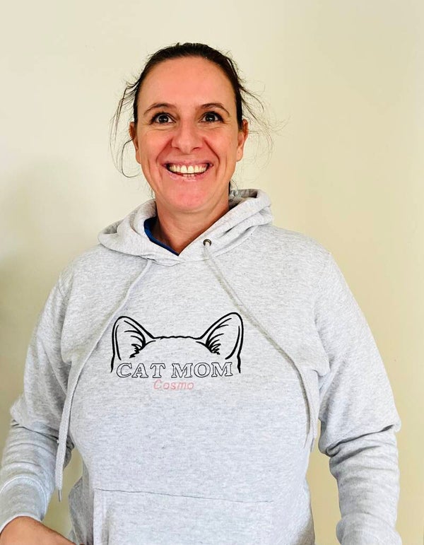 De oortjes en cat mom worden in het zwart geborduurd. De namen van je poezen worden geborduurd in kleur naar keuze . Alle kleuren zijn mogelijk